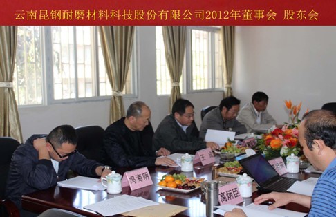 2012年3月24日,云南昆鋼耐磨材料科技股份有限公司首屆董事會(huì)第七次會(huì)議、股東會(huì)第五次會(huì)議在黑林鋪前街59號(hào)團(tuán)鋼廠院內(nèi)(原團(tuán)鋼子弟小學(xué))3樓會(huì)議室勝利召開。會(huì)議由董事長(zhǎng)李亞鵬召集和主持,云南昆鋼重型裝備制造集團(tuán)有限公司董事長(zhǎng)兼總經(jīng)理黃開萬、昆明新云欽耐磨材料總廠董事長(zhǎng)馮煥欽、昆明理工大學(xué)材料科學(xué)與工程學(xué)院院長(zhǎng)蔣業(yè)華等董事及云南昆鋼耐磨材料科技股份有限公司領(lǐng)導(dǎo)出席了會(huì)議。